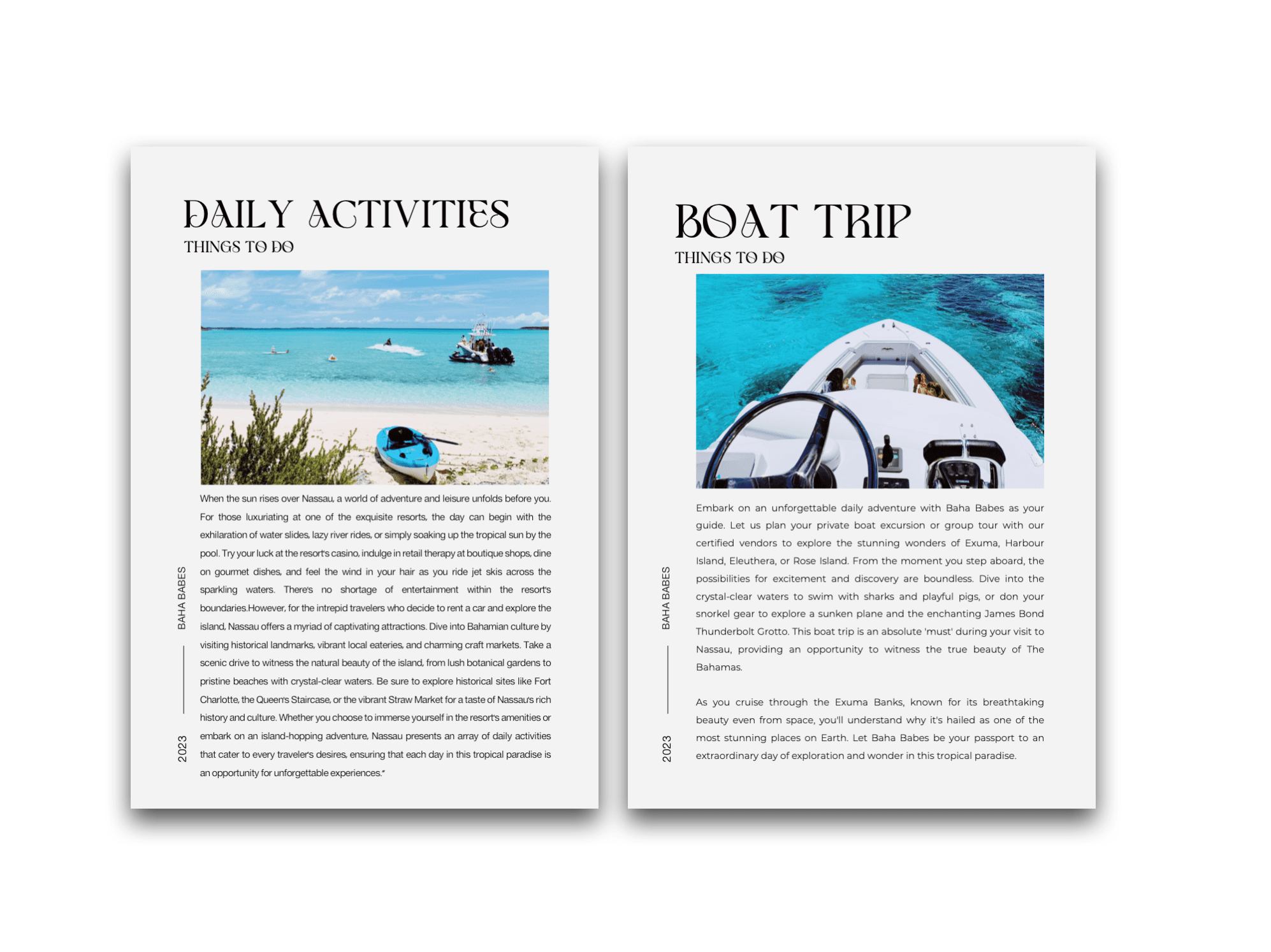 The Baha Babes Island Guide is a meticulously curated, all-in-one PDF packed with expert recommendations for exploring each island in The Bahamas. For just $30 per guide, you’ll unlock insider knowledge on the best restaurants, must-do activities, sunset drink spots, and hidden local gems—without the added cost of concierge services. Designed to make trip planning effortless, this guide provides everything you need, whether you're seeking adventure, relaxation, or a luxury escape. For those wanting a more personalized touch, you can upgrade to the Baha Babes Concierge Service, where a dedicated Baha Babe will craft a fully tailored itinerary for a seamless and unforgettable island experience.